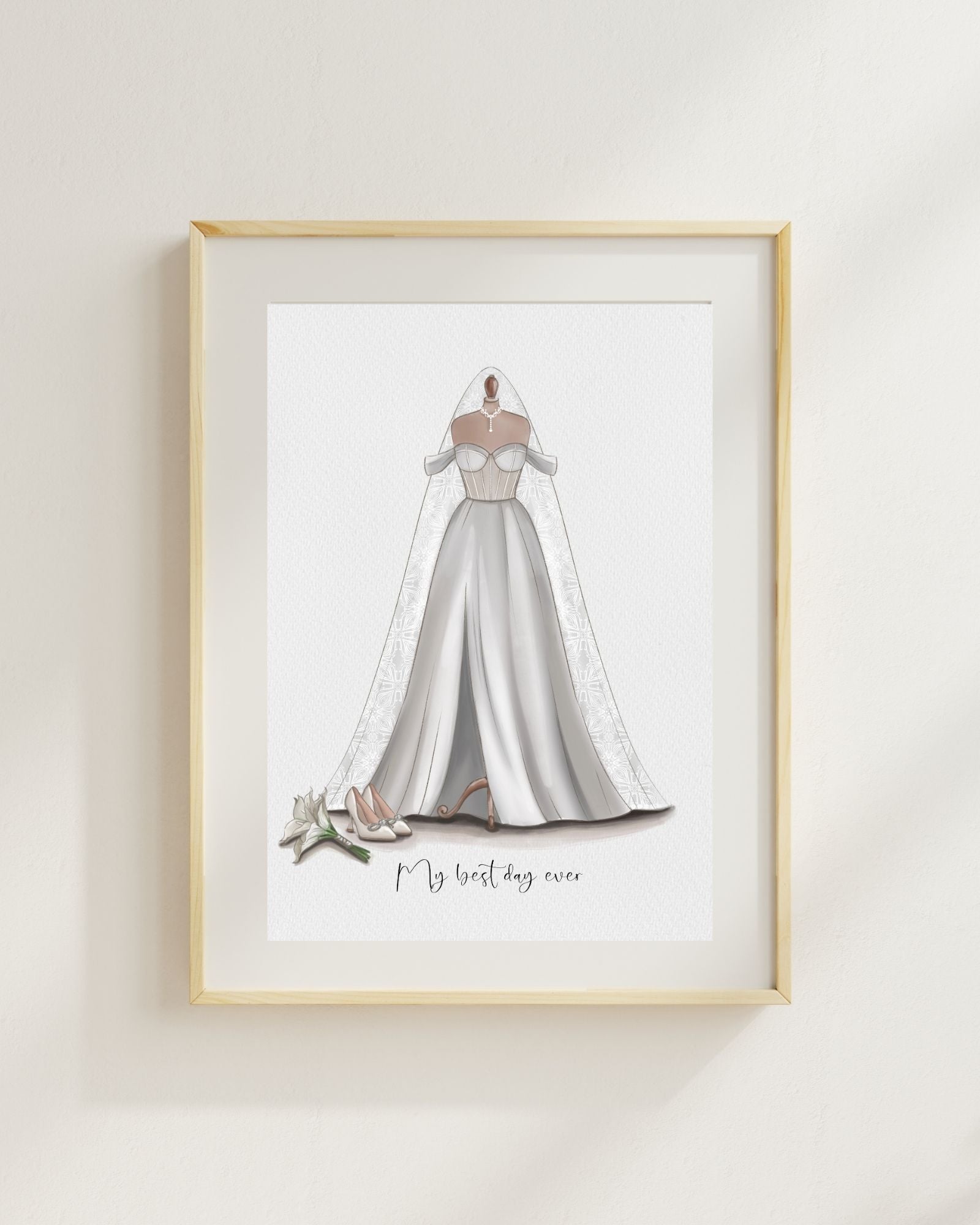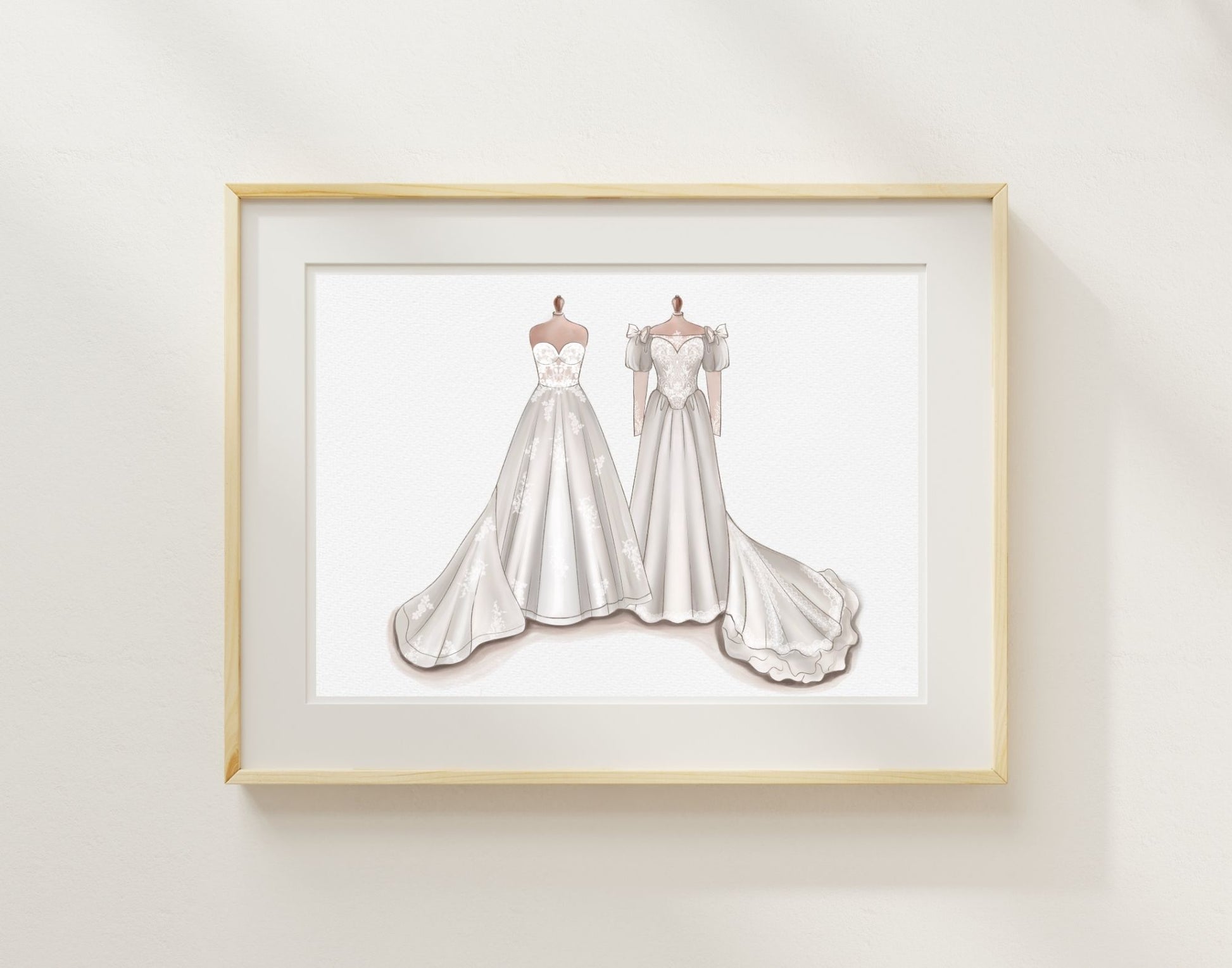 Get a custom watercolor hand-drawn illustration of your wedding dresses. I can draw your bridal gown together with your mother's wedding outfit, your bridesmaid's dress, or yours and your future husband's attires from your wedding day. This will become a timeless keepsake to beautifully show the elegance and style of your attire, cherishing best memories forever.