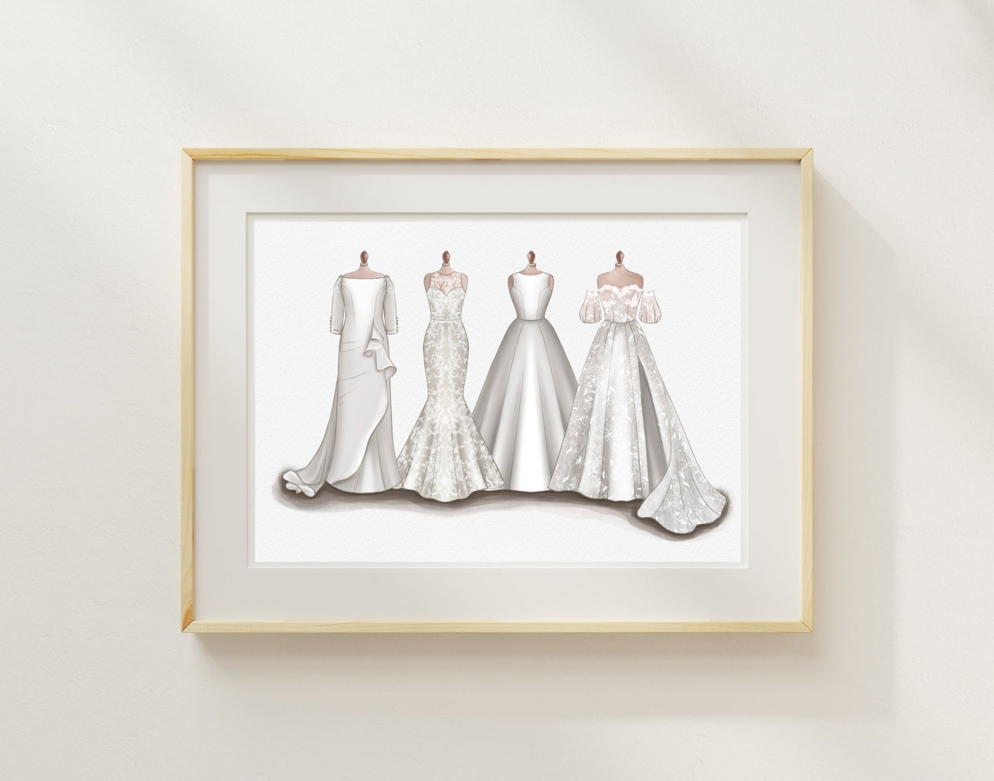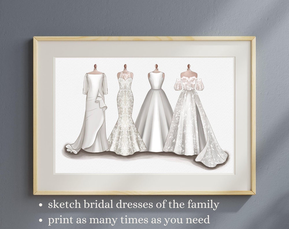 This is the PERFECT gift for your mother on your wedding day! Imagine how special it is to see three generations of wedding dresses in one illustration. Such a sentimental gift idea for your mother, mother in law, grandmother, or sister.